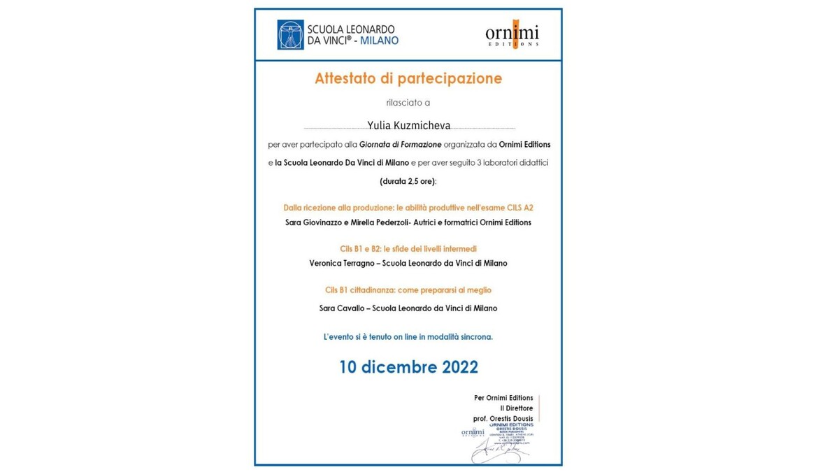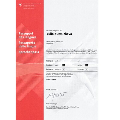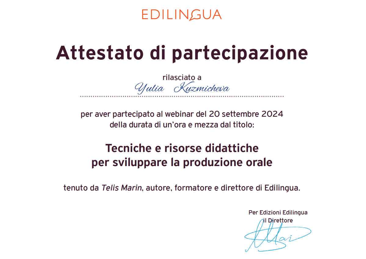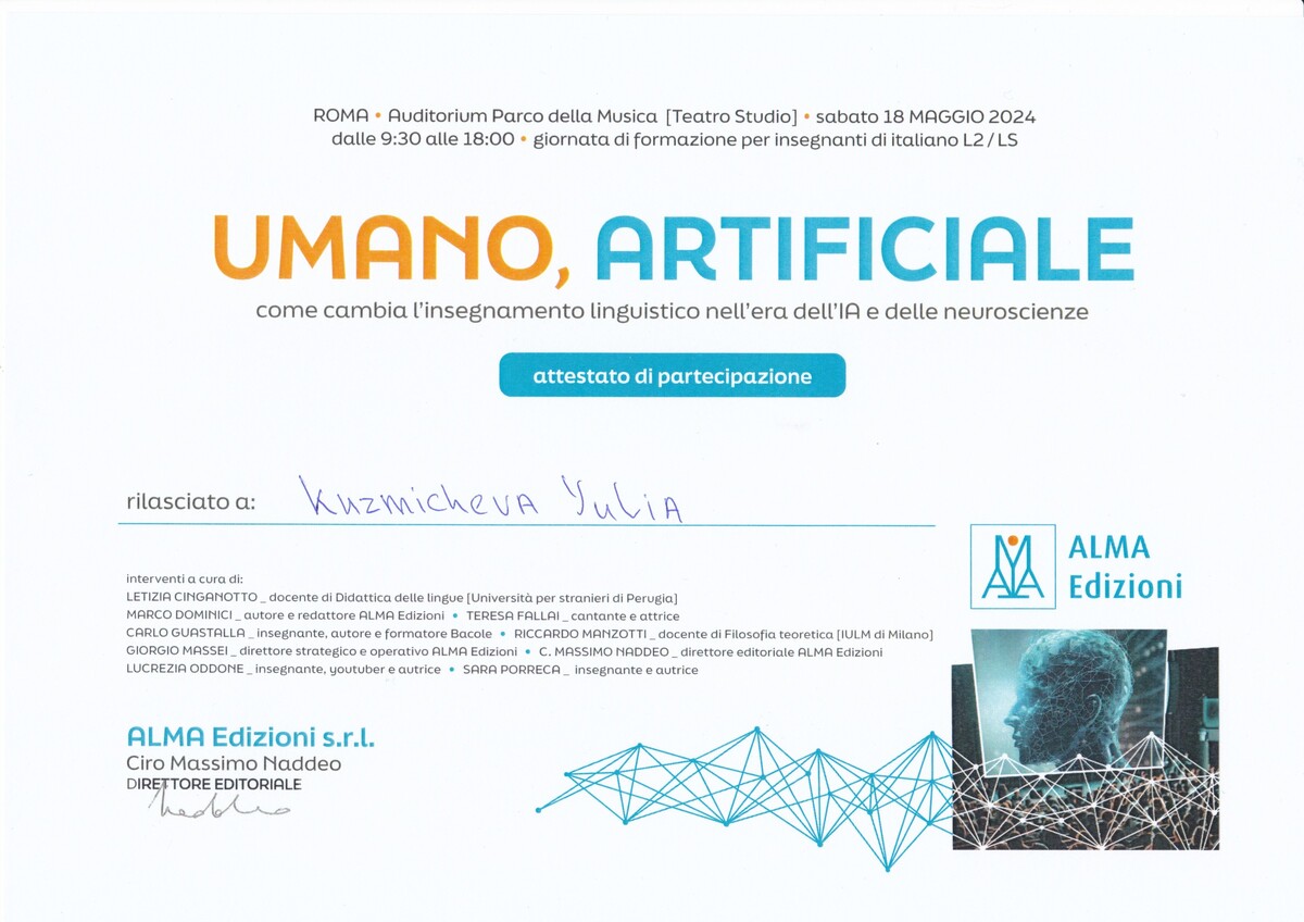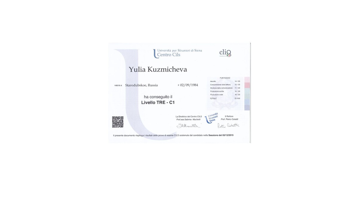 Обучаю итальянскому языку c 2016 года, готовлю к экзаменам для получения ВНЖ в Италии и Швейцарии, читаю лекции о Языках.